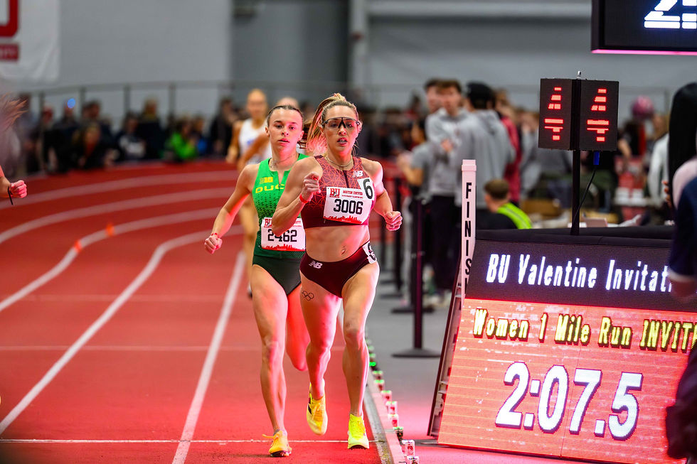 On Saturday, February 14, Elle St. Pierre competed in the David Hemery Valentine Invite at Boston University, where she set a new American indoor 1500m record with a time of 3:59.33 on her way to a mile finish in 4:17.83. Her fast pace pushed three collegiate athletes to run under the former NCAA mile record. Racing behind St. Pierre, Riley Chamberlain, Wilma Nielsen, and Jane Hedengren now hold the three fastest times in collegiate history, recording times of 4:20.61, 4:21.04, and 4:22.22, respectively.