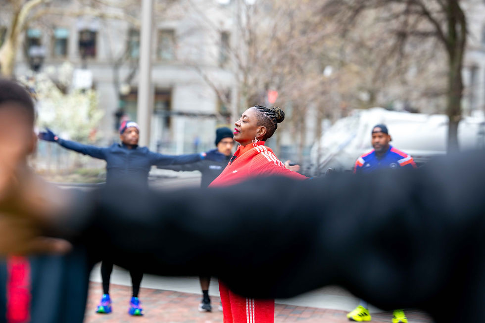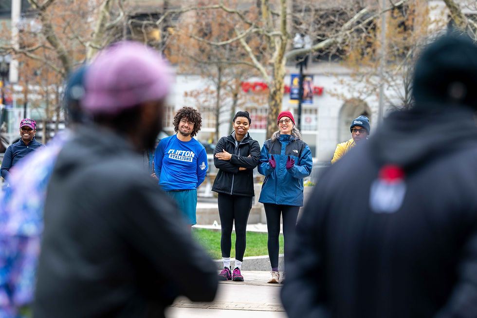 Over the course of 2.6 miles, the runners listened to stories that featured jazz clubs, historic homes, and community gathering spots that influenced the Black travel experience in Boston. This was a leisurely, conversational run centered on community, history, and exploration. The run ended at the Finish Line of the Boston Marathon.